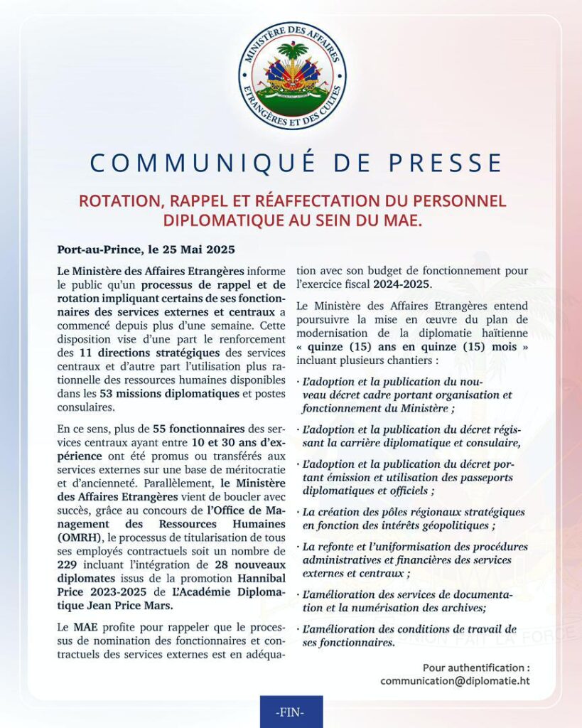COMMUNIQUE DU MINISTERE DES AFFAIRES ETRANGERES RELATIF A LA ROTATION, RAPPEL ET REAFFECTATION DE SON PERSONNEL DIPLOMATIQUE.