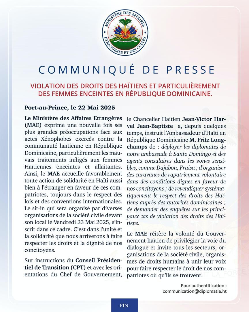 COMMUNIQUE DU MINISTERE DES AFFAIRES ETRANGERES RELATIF A LA VIOLATION DES DROITS DES HAÏTIENS ET PARTICULIEREMENT DES FEMMES ENCEINTES EN REPUBLIQUE DOMINICAINE.